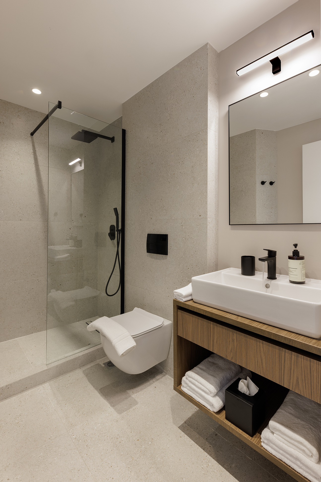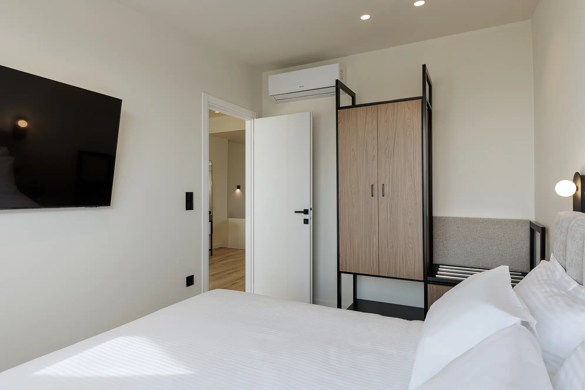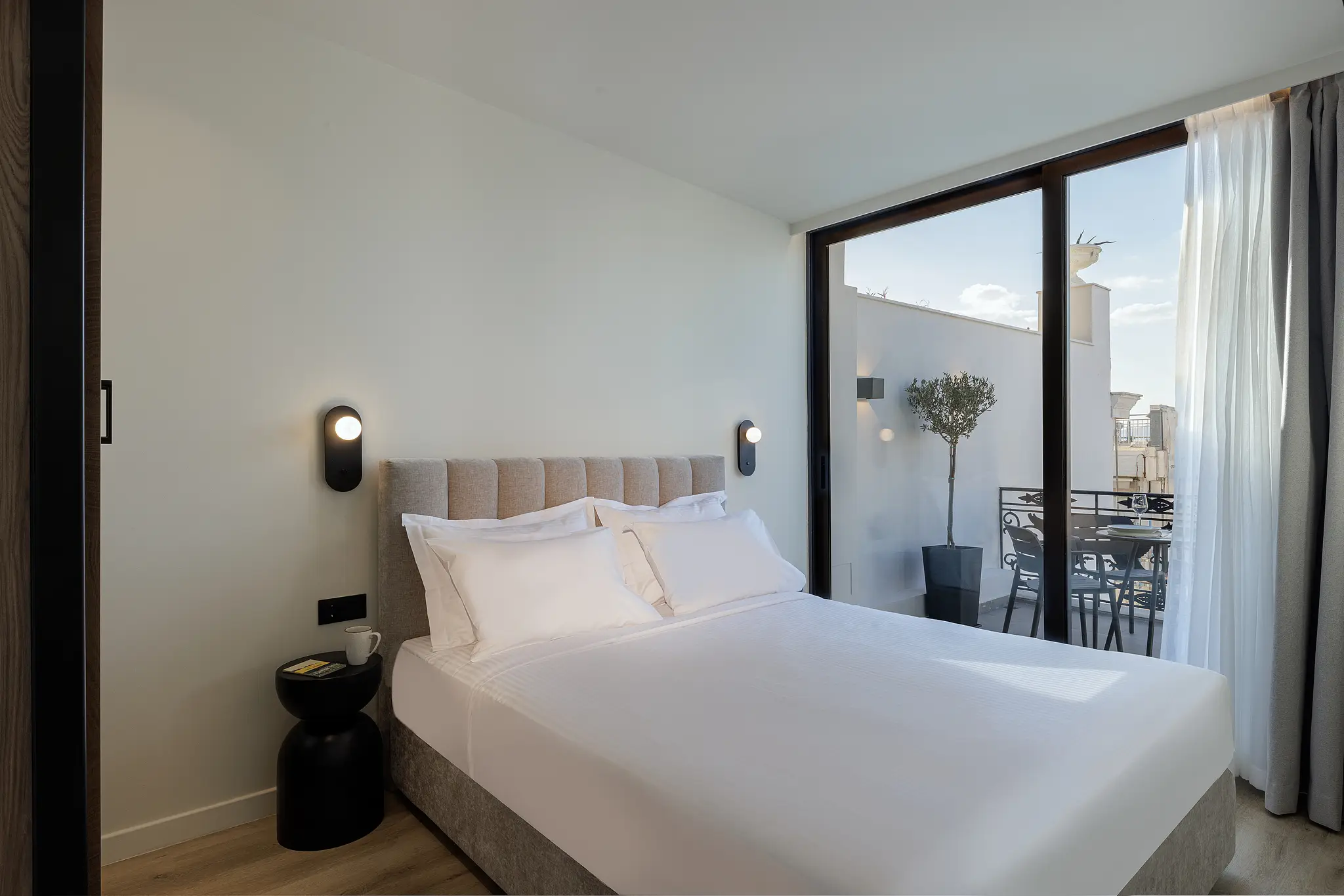 Το Μονόκλινο Ρετιρέ με Μπαλκόνι στο master Πλάκα Αθήνα είναι μια κομψή και άνετη επιλογή διαμονής για έως και τέσσερις επισκέπτες. Με 42 τ.μ. προσεγμένου χώρου, το ρετιρέ ακολουθεί μια μοντέρνα μίνιμαλ αισθητική, με ουδέτερους τόνους και λειτουργικά στοιχεία που προσφέρουν μια ήρεμη διαμονή.