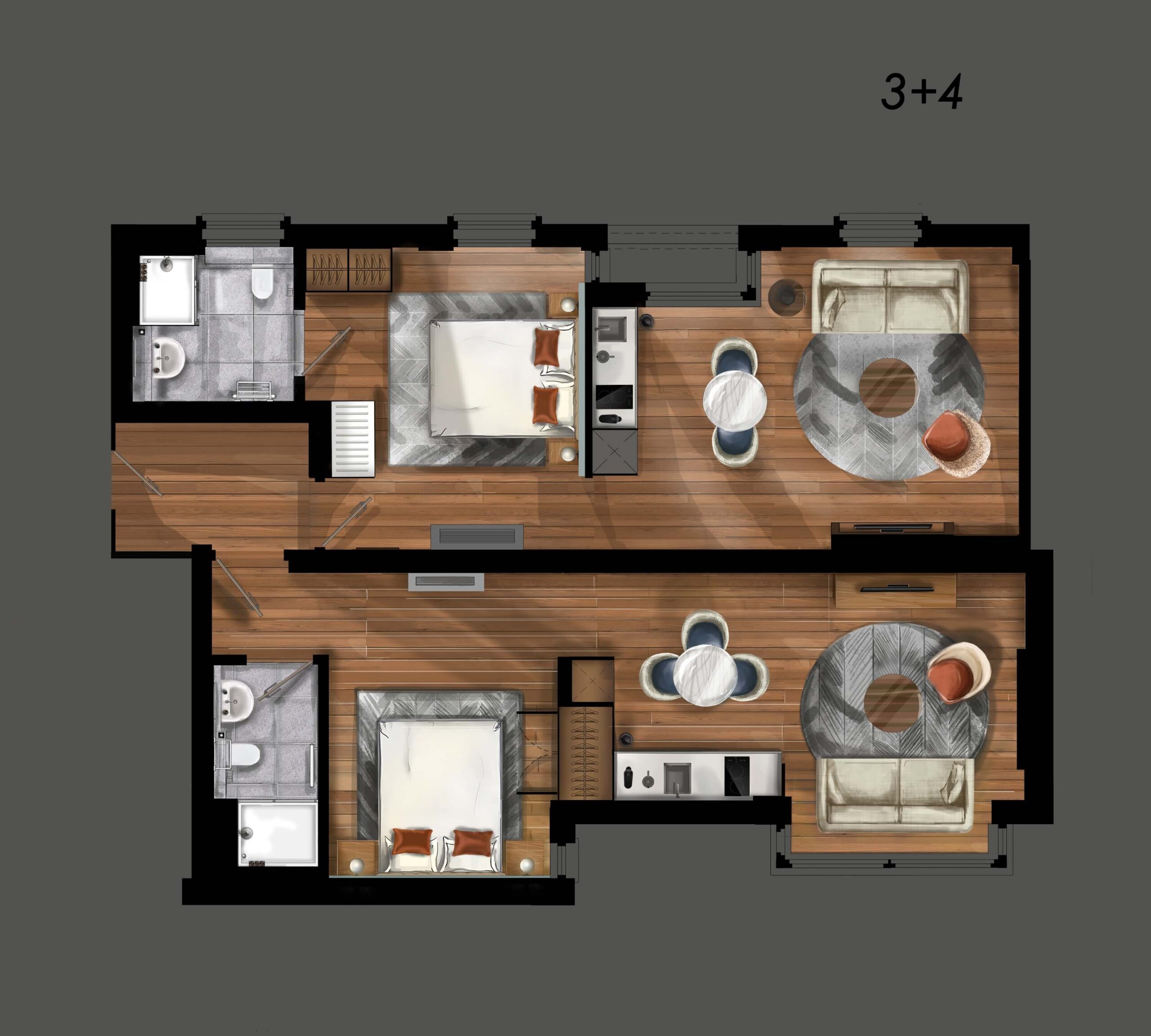 Ιδανικό για μεγαλύτερες παρέες, το ευρύχωρο Οικογενειακό Διαμέρισμα 73 τ.μ. φιλοξενεί άνετα έως και 8 άτομα. Ο σύγχρονος σχεδιασμός του, εμπνευσμένος από το mid-century στυλ, συνδυάζει απαλές αποχρώσεις του πράσινου και του μπλε, γήινους τόνους και φυσικές ξύλινες λεπτομέρειες, δημιουργώντας έναν αρμονικό και φιλόξενο χώρο για οικογένειες ή παρέες.