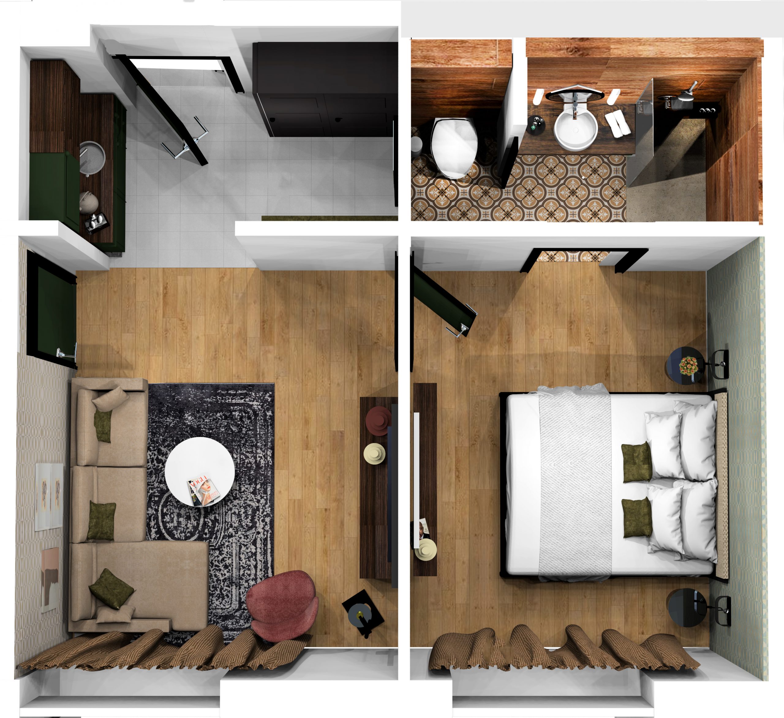 Το μονόκλινο διαμέρισμα των 35 τ.μ. είναι ιδανικό τόσο για επαγγελματικά ταξίδια όσο και για οικογενειακές διακοπές, συνδυάζοντας κομψότητα και άνεση.