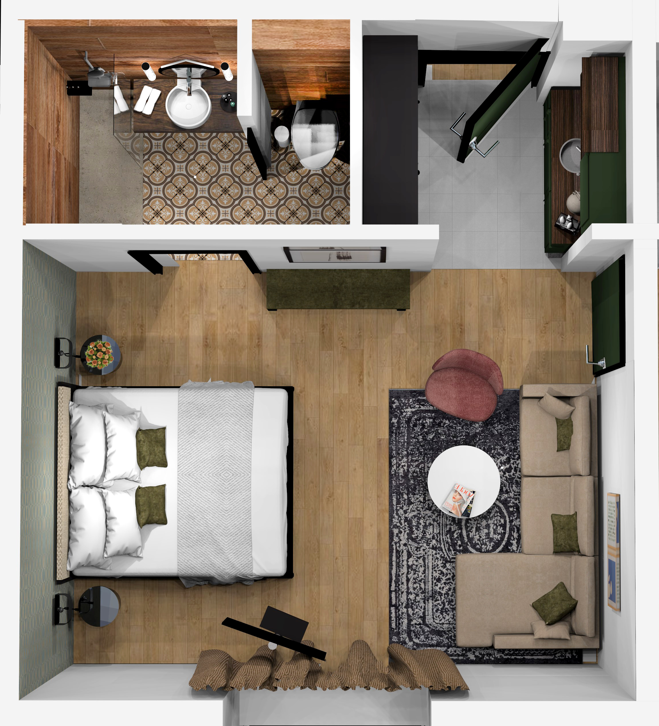Το Στούντιο Διαμέρισμα με Καναπέ-Κρεβάτι είναι ένας ζεστός και ευρύχωρος χώρος 28 τ.μ., ιδανικός για έως και 4 επισκέπτες. Προσφέρει εξοπλισμένη κουζίνα για να ετοιμάζετε λαχταριστά γεύματα. Παρέχει έναν ευέλικτο χώρο διαμονής με άνετο καναπέ, ιδανικό για χαλάρωση, που μετατρέπεται σε κρεβάτι για 2 άτομα. Το συγκεκριμένο στούντιο επικοινωνεί με ένα ακόμα διαμέρισμα μέσω κοινής πόρτας – ιδανικό για οικογένειες! Σφύζει από φυσικό φως και κομψή διακόσμηση, που δημιουργούν μια φιλόξενη και χαλαρωτική ατμόσφαιρα.